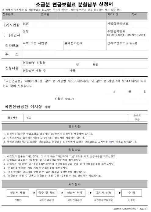 분할 납부는 2회 이상 연체한 지역가입자의 경우 신청가능합니다. 분할납부 신청서를 작성하여 최대 24회로 나누어 납입할 수 있습니다. 그 이유는 연금의 소멸 시효가 3년으로 되어 있어 그 기간이 지나면 징수 및 납입이 불가하기 때문에 2년 내에 납입을 하도록 하고 있습니다.